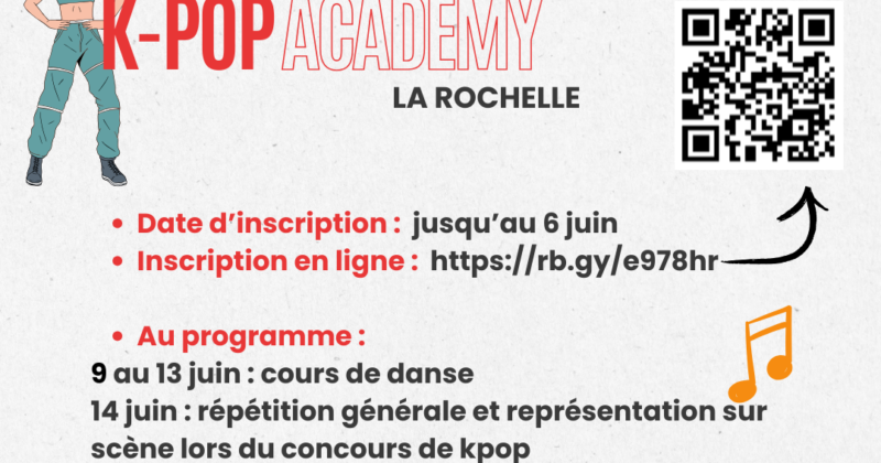 L’Institut Roi Sejong de La Rochelle propose des cours de danse « K-pop Academy » dans le cadre de son académie culturelle. Ces cours auront lieu entre le 9 et le 13 juin 2024 au SUAPSE. Le dernier jour, une présentation des apprentissages et un concours de K-pop (danses et chants) sont prévus.