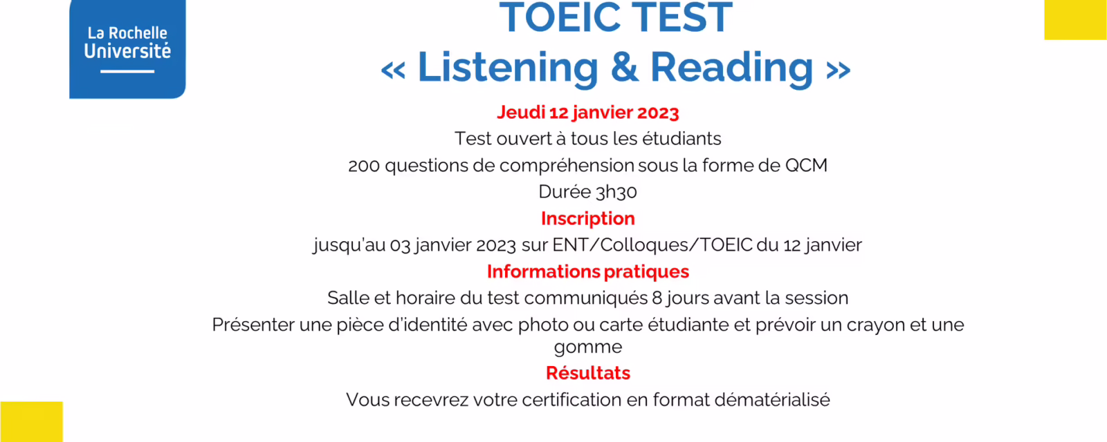 TOEIC TEST « Listening & Reading » jeudi 12 janvier 2023