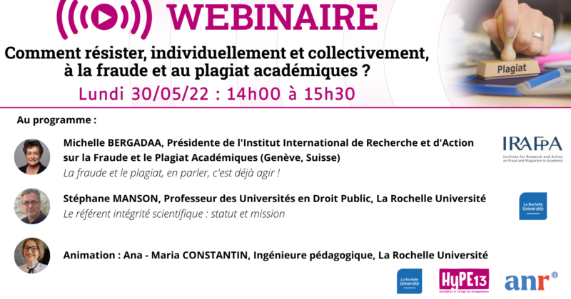Date : 30 mai 2022 Horaire : 14h Lieu : En ligne La Rochelle Université, membre de l'IRAFPA, organise le webinaire " Comment résister, individuellement et collectivement, à la fraude et au plagiat académiques ?". Michelle Bergadaà, présidente de l’IRAFPA et Stéphane Manson, professeur des universités en droit public, référent intégrité scientifique à La Rochelle Université, interviendront lors de cet événement. En savoir +