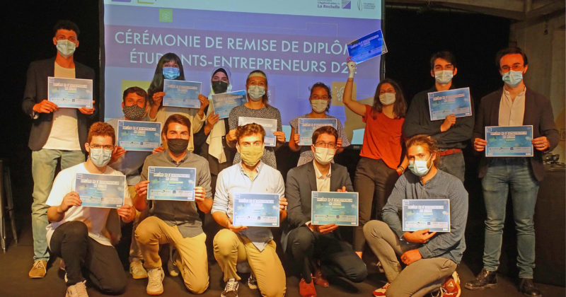 Les Étudiants-Entrepreneurs à l’honneur La Rochelle Université > L’Université > Espace Presse > Communiqués de presse de La Rochelle Université > 2021 > Les Étudiants-Entrepreneurs à l’honneur Publié le 11 juin 2021 Jeudi 10 juin, la Sirène a accueilli la remise de diplômes des Étudiants-Entrepreneurs (D2E) organisée par CampusInnov, le catalyseur de l’innovation et de l’entrepreneuriat de La Rochelle Université. L’occasion idéale de mettre un coup de projecteur sur les projets ambitieux de ces étudiantes et étudiants, ainsi que de récompenser 4 projets par des prix spéciaux décernés par la Fondation La Rochelle Université et CampusInnov Les Étudiants-Entrepreneurs de La Rochelle Université, de l’EIGSI, du Cesi et d’Excelia n’attendaient que ça : l’occasion de pouvoir enfin tous et toutes se retrouver en présentiel afin de recevoir leur diplôme D2E, les récompensant de leur ténacité lors de cette année un peu particulière. Accompagné·es des référentes et référents entrepreneuriat et avec le soutien de l’Agglomération de La Rochelle représentée par Vincent Demester qui a introduit cette 4e cérémonie, ils et elles ont vu leurs efforts récompensés avec l’obtention de leur diplôme. Le sésame en poche et le savoir en tête, ils et elles ont dorénavant toutes les armes afin de faire grandir leurs projets entrepreneuriaux. Beaucoup de projets sont d’ailleurs actuellement en pleine expansion : signature de premier·es client·es, phase tests avant lancement, etc. Un bel avenir à l’horizon pour des projets ambitieux et des jeunes diplômé·es motivé·es. L’entrepreneuriat étudiant en plein essor Avec 25 diplômé·es contre 15 l’année dernière, la formation du D2E séduit de plus en plus, avec une augmentation de 25 % d’inscrites et inscrits et de 40 % de réussite. Grâce au Statut National Étudiant-Entrepreneur (SNEE), ces entrepreneurs et entrepreneuses sont accompagné·es dans leur parcours par une équipe d’expert·es afin de leur donner les clés de la réussite. Lors des 70 heures de formation, les jeunes ont pu profiter d’un véritable sas de préparation au lancement de leurs projets, en bénéficiant à la fois de formation et de coaching balayant tous les aspects du processus de création. Loin de les freiner, la situation sanitaire semble en avoir inspiré plus d’un, au vu des résultats des 19 projets représentés. Lors de cette remise de diplômes, différent·es acteurs et actrices de la vie socio-économique du territoire se sont réuni·es afin d’encourager les diplômé·es et de découvrir leurs idées novatrices au travers des pitchs projets. Pour Jean-Marc Ogier, Président de La Rochelle Université, « Les jeunes que nous formons aujourd’hui sont un peu différents de ceux que l’on formait jusqu’ici. En formant des jeunes qui ont à la fois des connaissances techniques pour pouvoir s’insérer dans les milieux professionnels mais aussi qui ont toutes les caractéristiques humaines pour créer de la valeur, nous avons aujourd’hui des étudiant·es qui peuvent contribuer au développement économique en créant eux-mêmes leur activité. » Les prix de la Fondation La Rochelle Université Cette année, la Fondation La Rochelle Université, accompagnée de deux de ces partenaires, le Lions Club La Rochelle Pernelle Auffredy et la Banque Populaire Centre Atlantique, ainsi que CampusInnov, ont tenu à remettre des prix aux projets les plus méritants. Quatre projets dans l’air du temps, prônant des valeurs d’écologie, de partage et résolument tournés vers l’avenir. Prix de l’innovation : Eli Développement d’une application mettant l’intelligence artificielle au service de l’écologie des particuliers Pour en savoir plus, rendez-vous sur leur page Instagram @eliapp.io Prix de l’engagement social et environnemental : Loopost Service de collecte et revalorisation des biodéchets sous forme de compost Pour en savoir plus, rendez-vous sur Facebook et LinkedIn @Loopost et Instagram @_loopost_ Prix coup de cœur : Kiizmi Conciergerie digitale Pour en savoir plus, rendez-vous www.kiizmi.com Prix de la jeune pousse DeepTech : Cleaque Conception d’une coque de téléphone antimicrobienne à base de cuivre Pour en savoir plus, rendez-vous sur Facebook et Instagram @Cleaque L’année des Étudiants-Entrepreneurs n’est pas terminée, puisque l’appel à candidature des prix PEPITE est actuellement en cours. La cérémonie qui viendra récompenser les 5 meilleurs projets de PEPITE ECA aura lieu à la rentrée 2021-2022. Qu’est-ce que le D2E ? Pour qui ? Étudiant·es ou jeunes diplômé·es titulaires du Statut National Étudiant-Entrepreneur (PEPITE) Quand ? Les cours ont lieu de novembre à avril Comment ? Après obtention du SNEE et passage devant le jury Combien de temps ? Le diplôme est délivré en une année scolaire Contact CampusInnov – PEPITE Swann Péré – 07 60 92 71 98 Documents à télécharger Communiqué de presse du 11 juin 2021 Dans cette rubrique La Rochelle Université et La Sirène signent une convention de partenariat Lauréate de l’appel à projets Excellences sous toutes ses formes, La Rochelle Université obtient 16 M€ Le président et le rapporteur de la mission sénatoriale sur les conditions de vie étudiante à La Rochelle Université le 29 novembre LANCEMENT D’UN DISPOSITIF INNOVANT DE LUTTE CONTRE LES VIOLENCES SEXUELLES ET SEXISTES La Rochelle Université se mobilise pour la professionnalisation des étudiant·es et zoome sur la RSE La Rochelle Université accueille un colloque sur la performance artistique dans les Amériques Conférence sur l’évolution du littoral avec Isabelle Autissier et Éric Chaumillon LA ROCHELLE UNIVERSITÉ / VALBIOTIS, une Keynote pour célébrer une collaboration réussie Rencontres LUDI, une 3<sup>e</sup> édition européenne La Rochelle Université lauréate de l’AMI national sur l